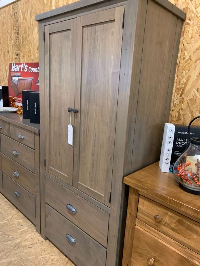 2 Door, 2 Drawer Armoire -74 inches high, 35 inches wide, 20 inches deep. Finished in our Driftwood Sand Stain.
